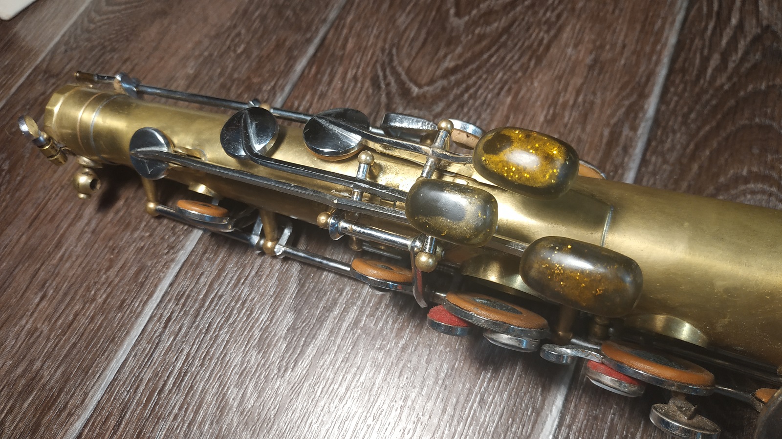 Недавно был в ремонте замечательный французский саксофон Dolnet tenor, во всех смыслах замечательный саксофон но с детской болезнью - низкие не адаптированные к кисти руки клавиши альтиссимо. На этот инструмент я установил накладки в цвет латуни, для удобства игры на дудке. Накладки изготовлены адаптировано для каждого пальца.