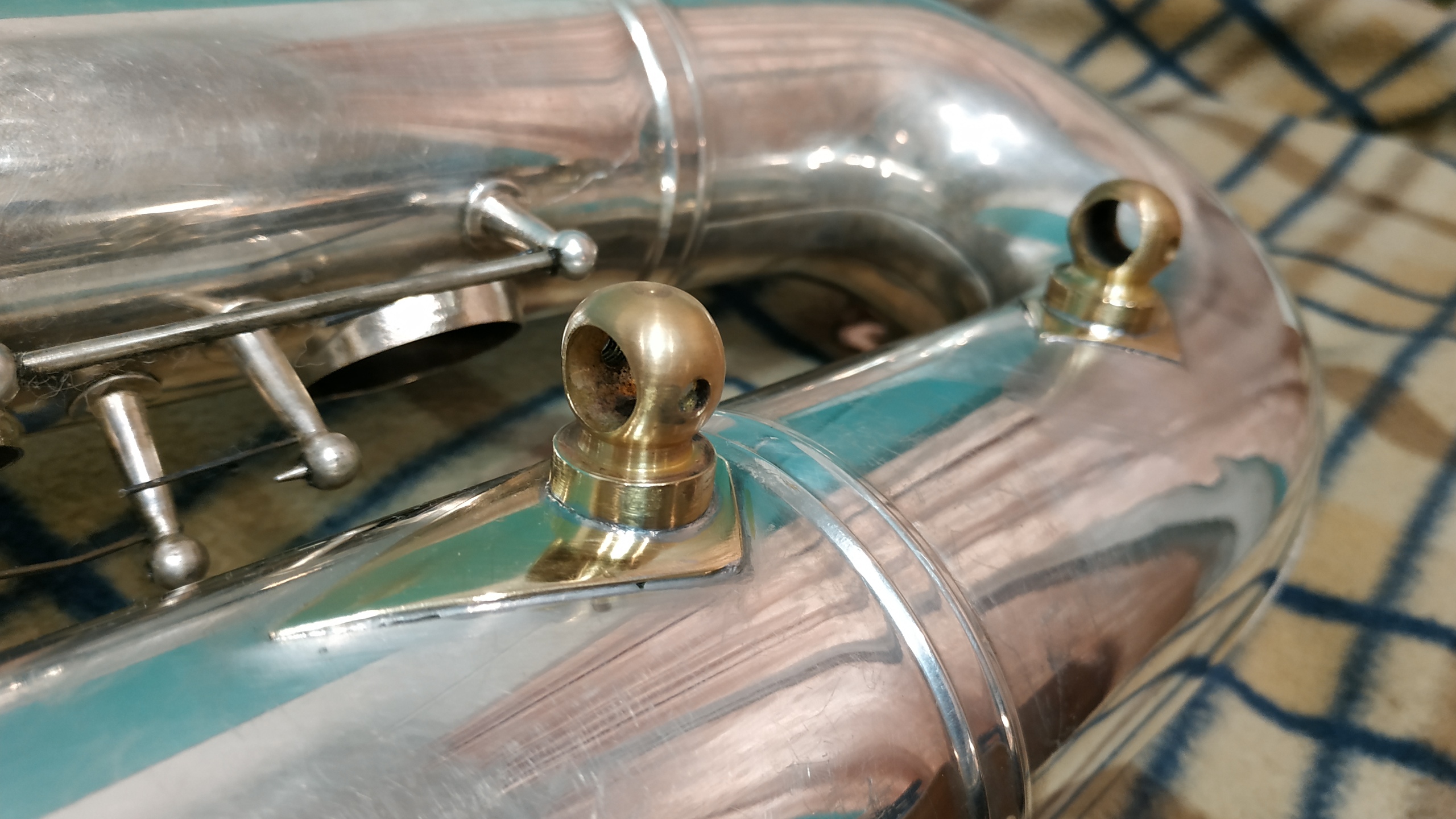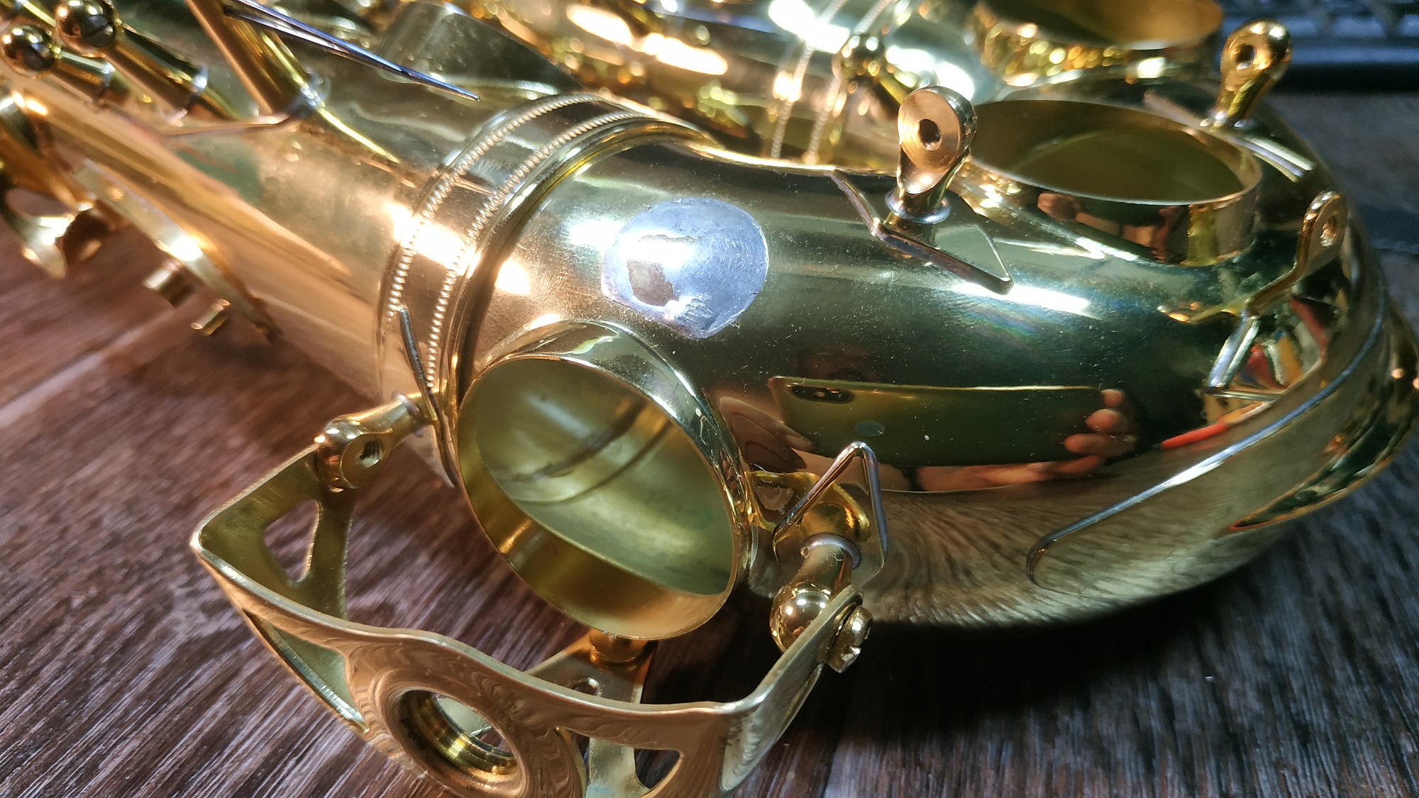 Пайка с минимальной потерей лака. Недавно была в ремонте Yamaha 62 alto, инструмент после падения. Стандартная картина - вбитая в корпус стройка Eb первой октавы. Проведенные работы - снятие стойки, правка вмятины, вытягивание кромки колодца клапана, пайка стойки обратно. Пайка на фото -