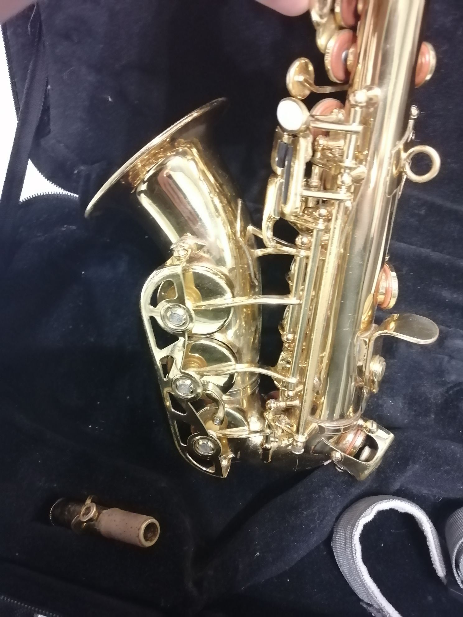 На корпусе саксофона есть потертости (внимательно смотрите фото), которые на качество звука не влияют. Комплектация полная: саксофон, эска, мундштук с лигатурой и колпачком , жёсткий родной фирменный чехол , трости, гайтан, наклейки на мундштук, смазка для пробки. Смотрите фото и видео