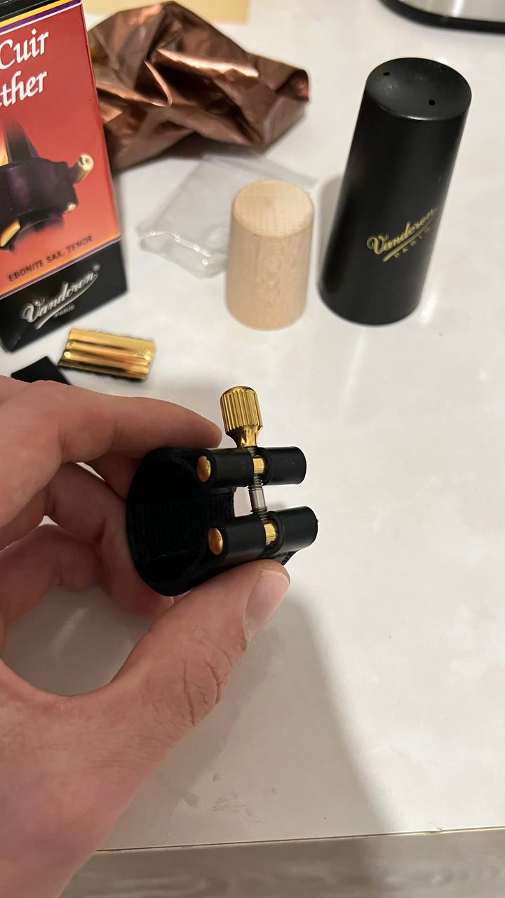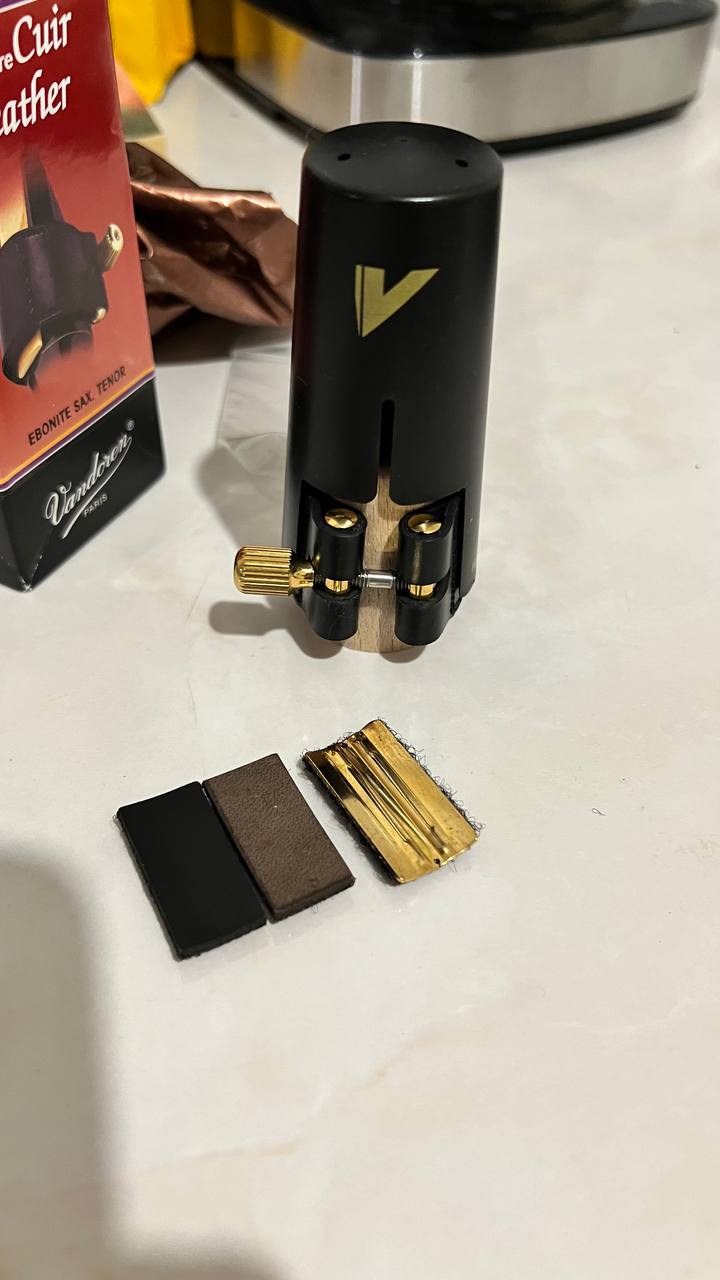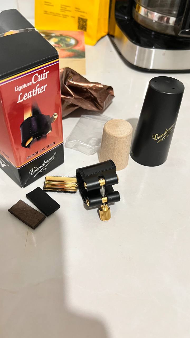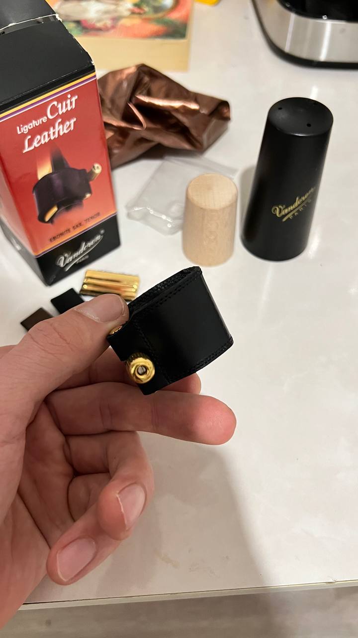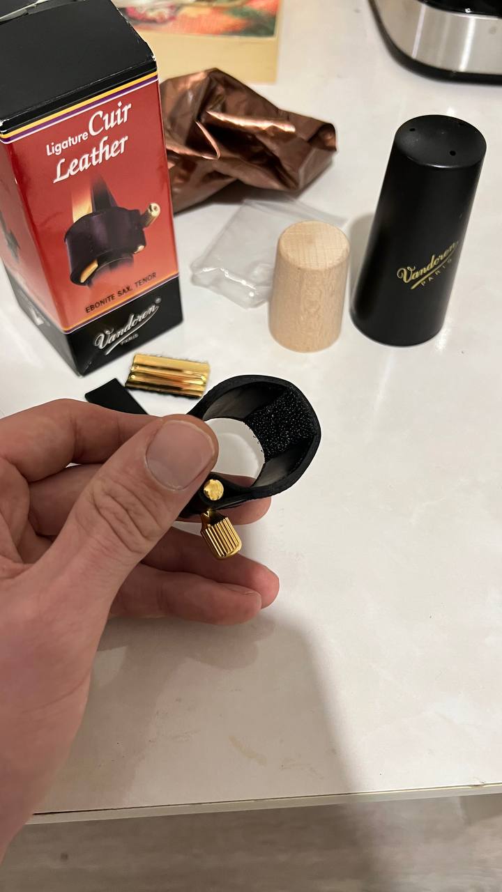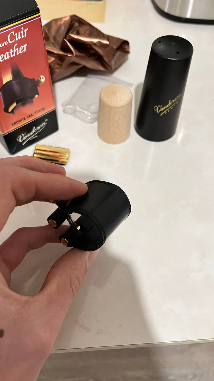 Кожаная лигатура для тенора в отлином состоянии и полном комплекте(коробка, колпачек, лигатура, пластины)