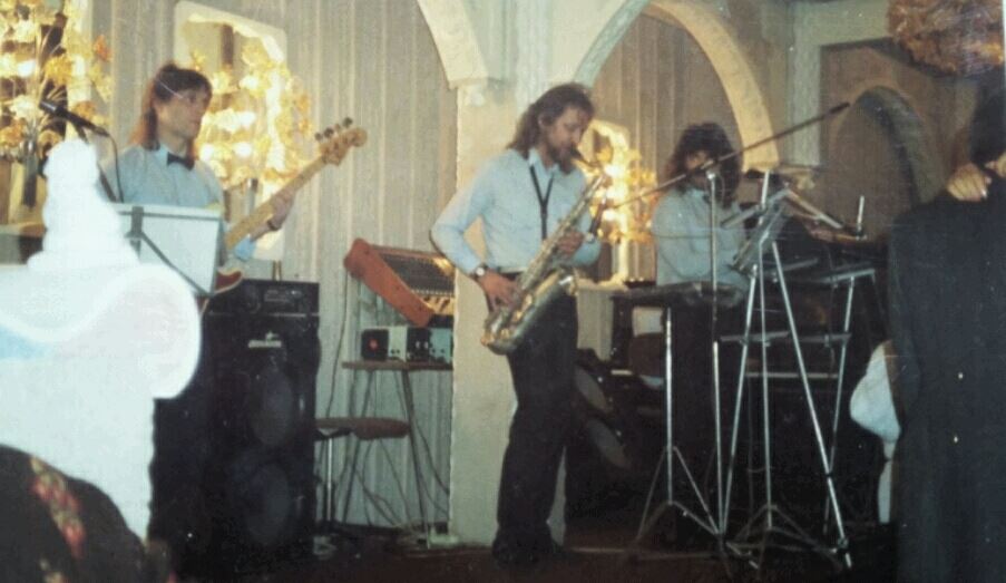 Фоток не осталось, хотя вот, одна есть, там правда предыдущий саксофонист Игорь Колотовкин, но аппарат и сцена та же, клавишник был другой, Вова Бугаенко, из Томска.