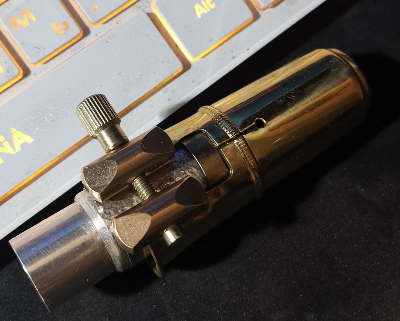 колпак подходит металлический от альтового эбонита, только бока прорези нужно подогнуть. посколько я ставлю лигу назад, то пришлось в прорезь, подклеить на суперклей, кусочек жести, так как не хватает длины колпака при максимальном задвиге, и кончик трости можно коцнуть изнутри, внутренним торцом мундштука.