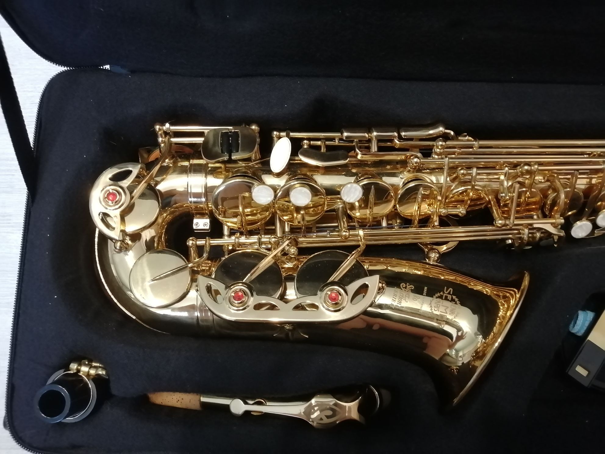 Комплектация полная: саксофон, эска, мундштук с лигатурой и колпачком , гайтан, фирменный очень удобный полужесткий кофр “Selmer", трости, наклейки на мундштук, салфетка для ухода, ершик для чистки, смазка для эски. Внимательно смотрите фото и видео звучания инструмента