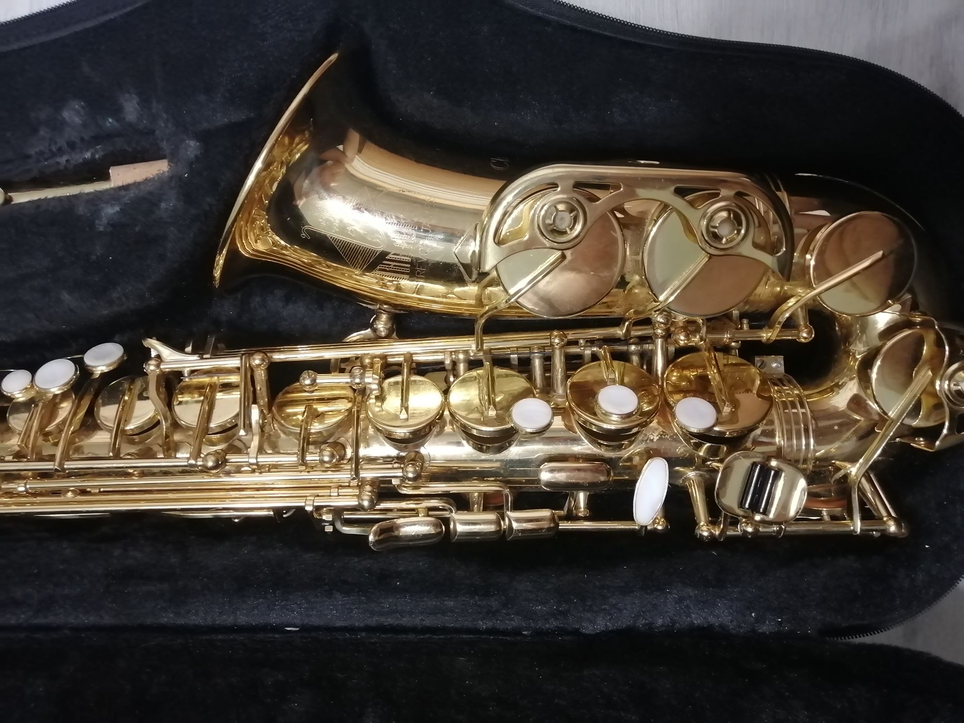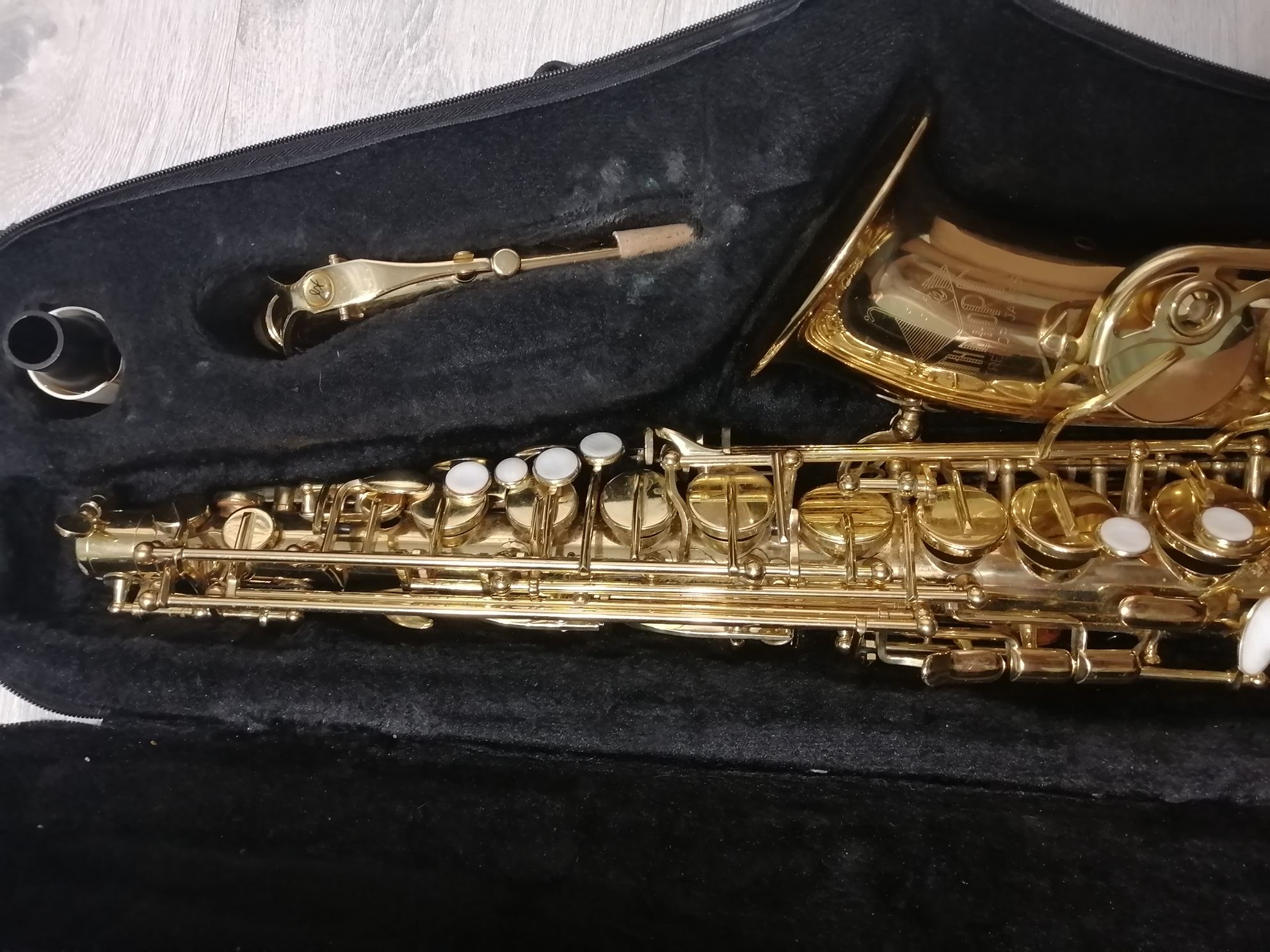 Комплектация полная: саксофон, эска, мундштук с лигатурой и колпачком , гайтан, фирменный очень удобный полужесткий кофр , трость, наклейки на мундштук, мундштук.