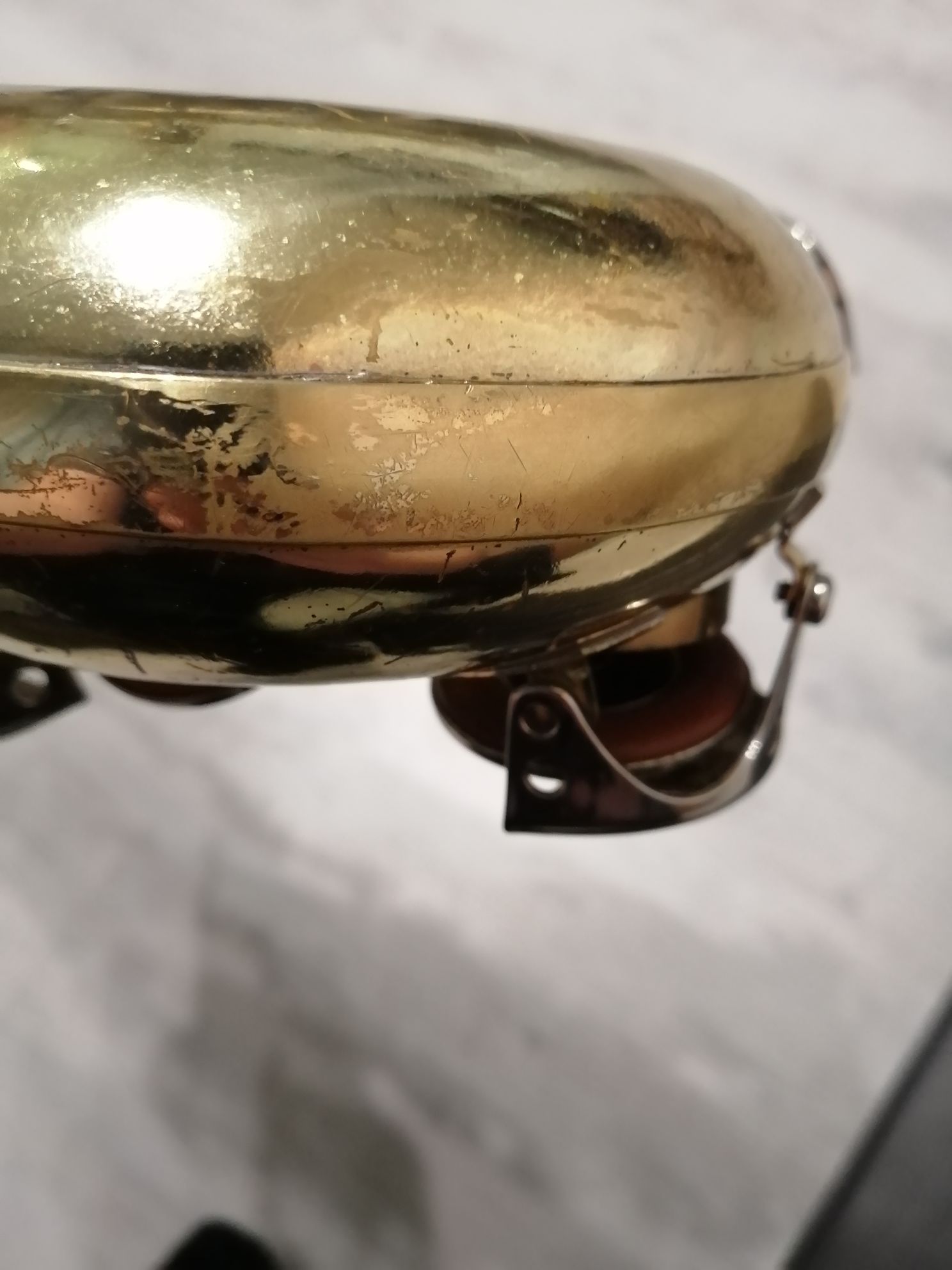 Из минусов отмечу потертости и царапинки на корпусе саксофона и незначительную вмятинку внизу сапога (смотрите фото). Подушки у инструмента не новые, но состояние у них нормальное.