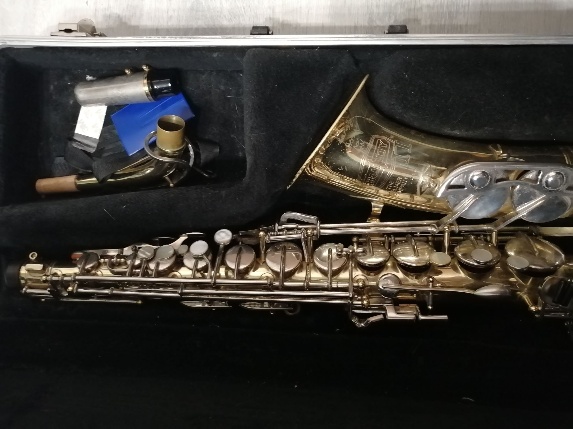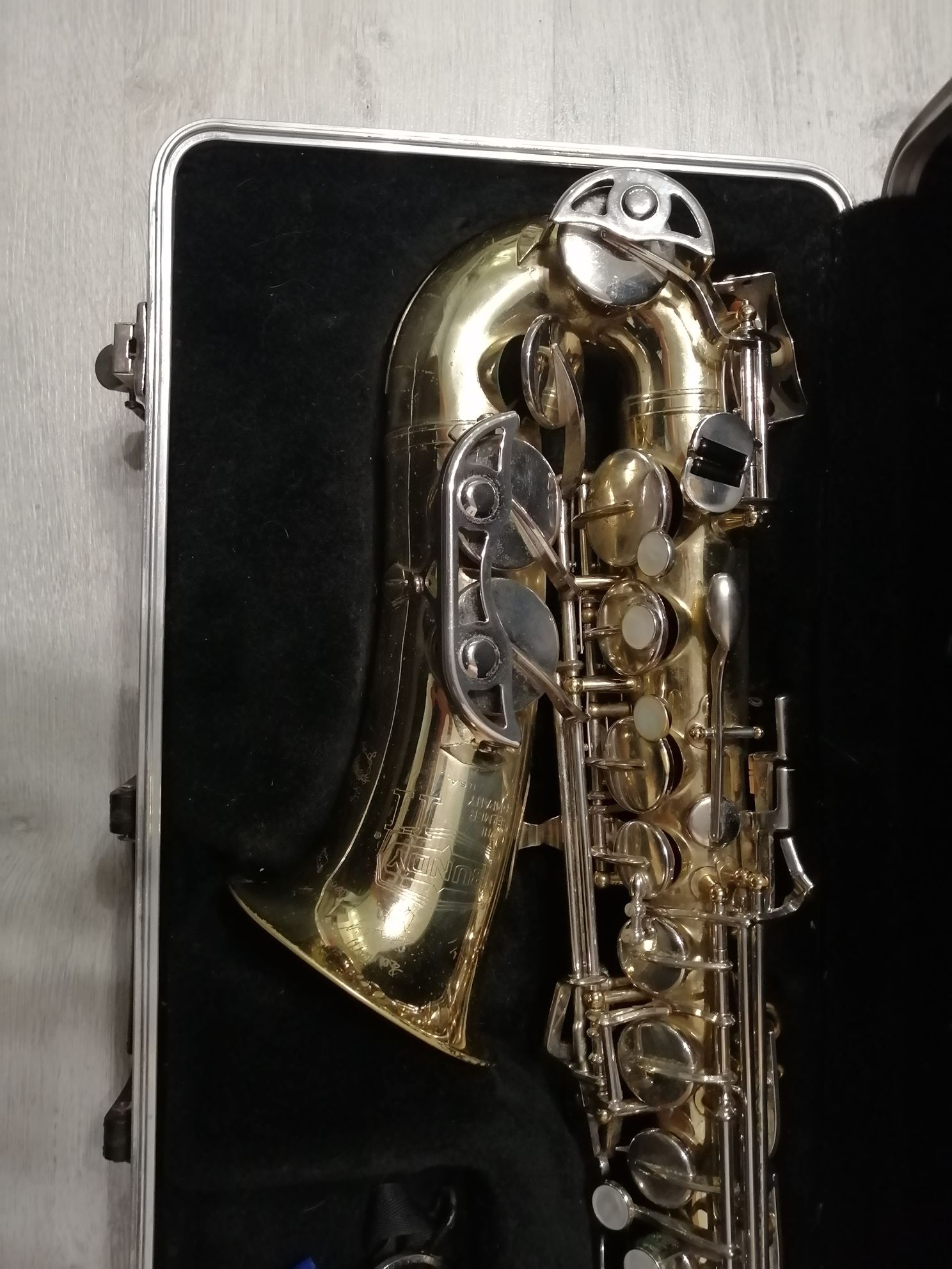 Комплектация полная: саксофон, эска, мундштук с лигатурой и колпачком , гайтан, жесткий кофр, трость, наклейки на мундштук.