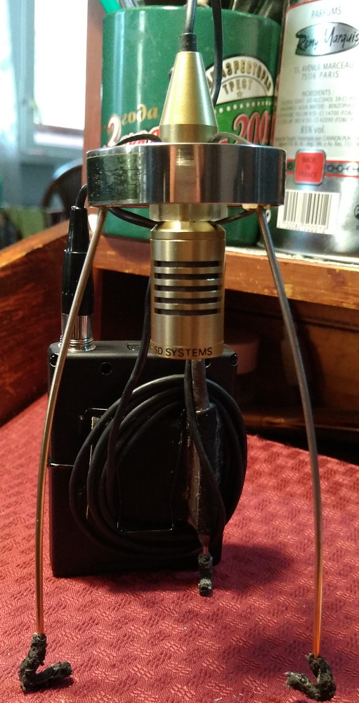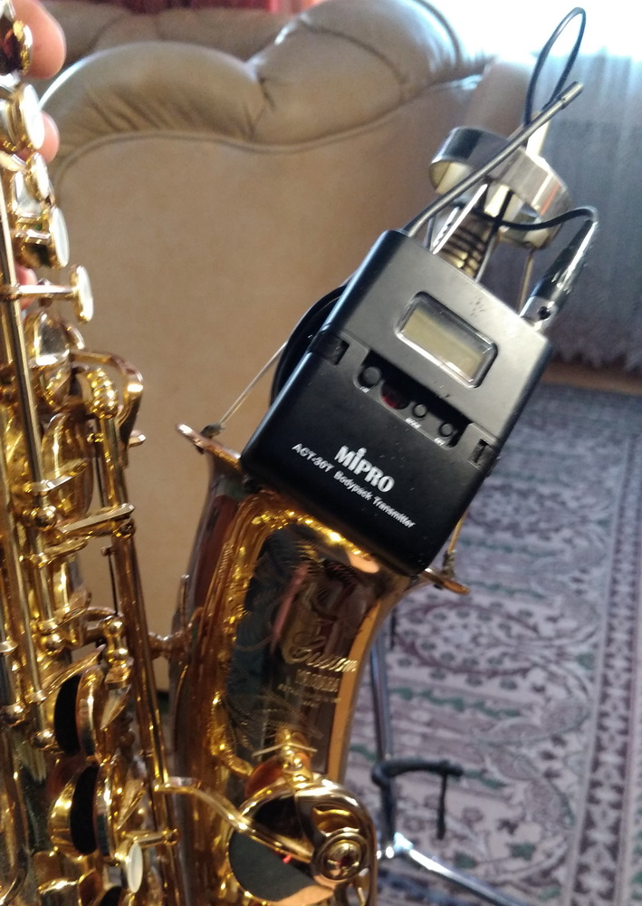 Передатчик можно снять с треноги, и использовать традиционно, на поясе, но на раструбе удобнее, никаких цепляющихся проводов, и ставится на сакс и снимается за 2 секунды!