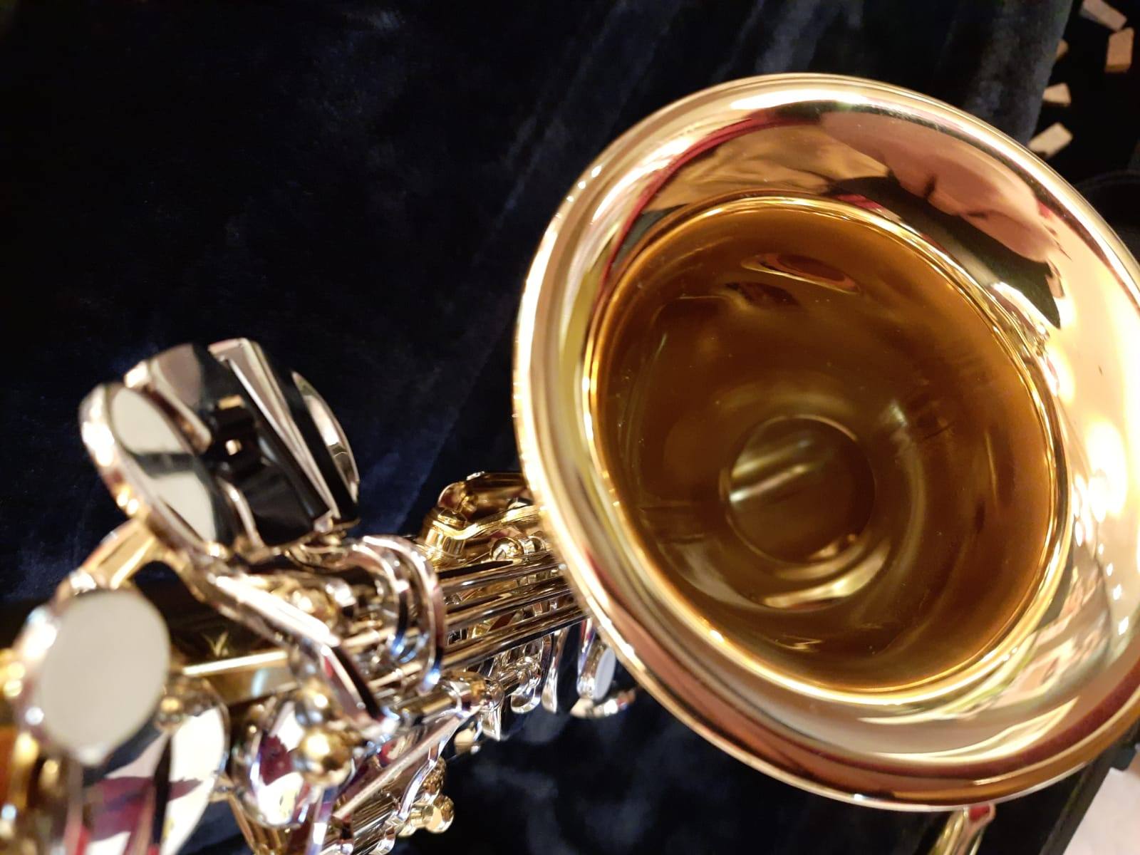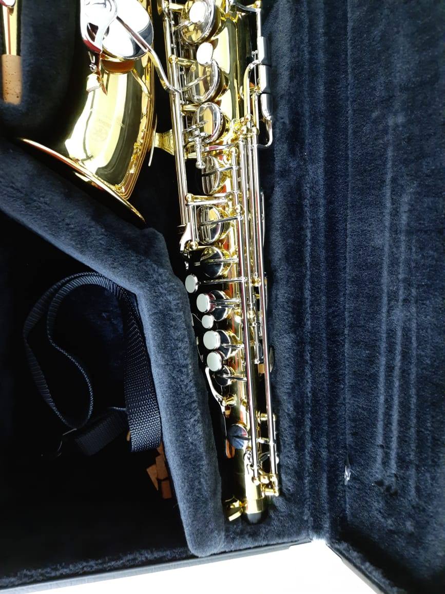 Комплектация полная: саксофон, эска, Мундштук "Yamaha 4c" с лигатурой и колпачком, гайтан, фирменный очень удобный жёсткий кофр "Yamaha", трость.