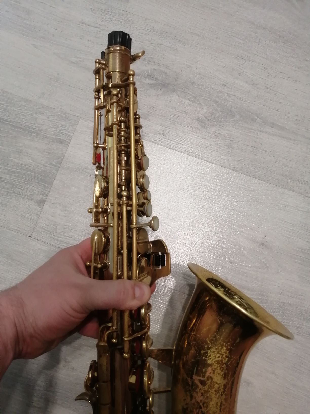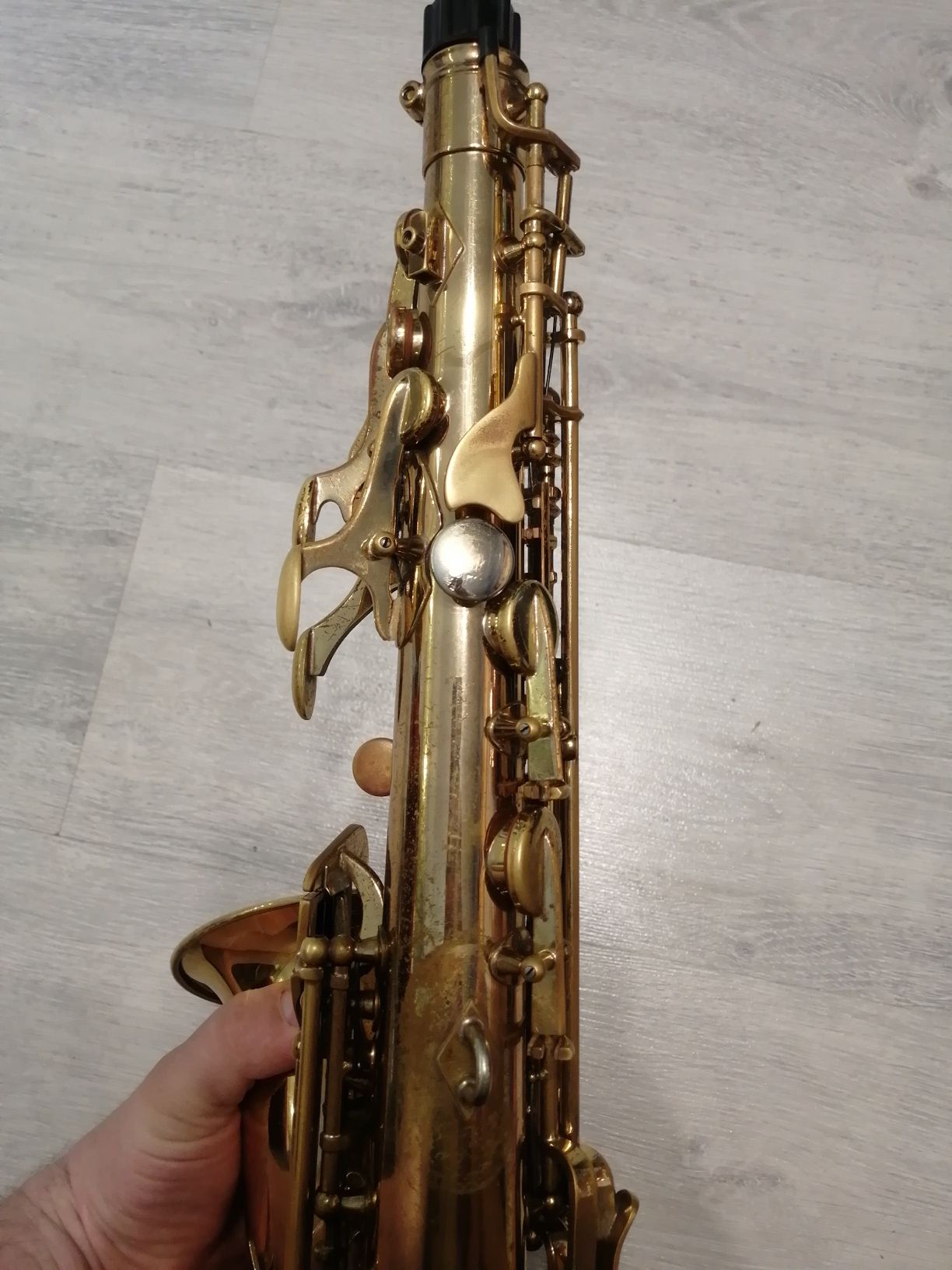 Состояние хорошее. Саксофон недавно перекрыт (на клапанах стоят новые подушки). Есть дефекты по корпусу саксофона: царапины и небольшая вмятинка на эске. На звучание и строй инструмента они никоим образом не влияют.