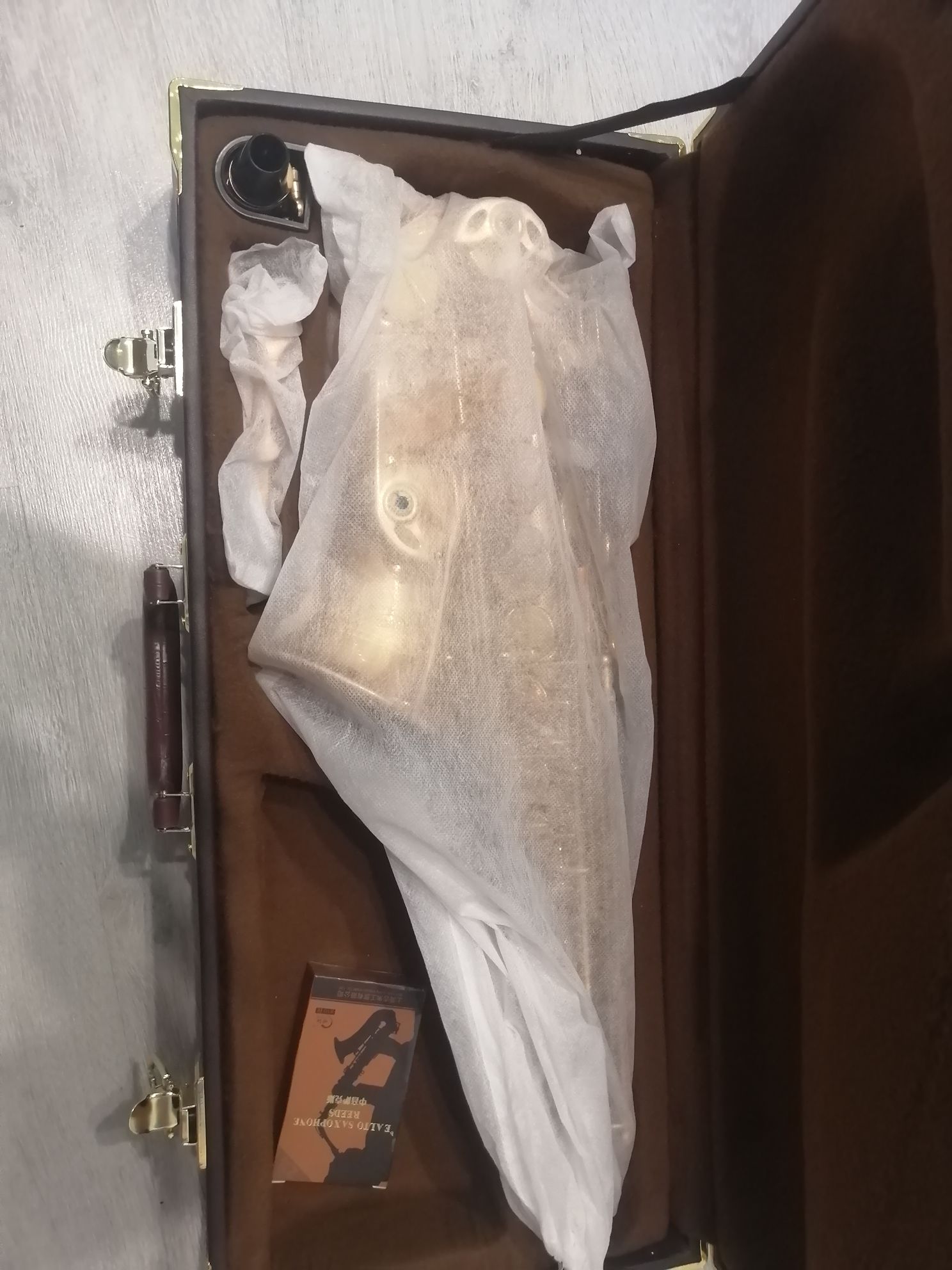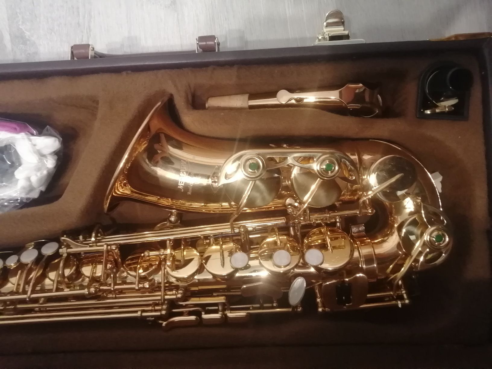 Комплектация полная: саксофон, эска, мундштук с лигатурой и колпачком , гайтан, трости, наклейки на мундштук, жёсткий кофр.