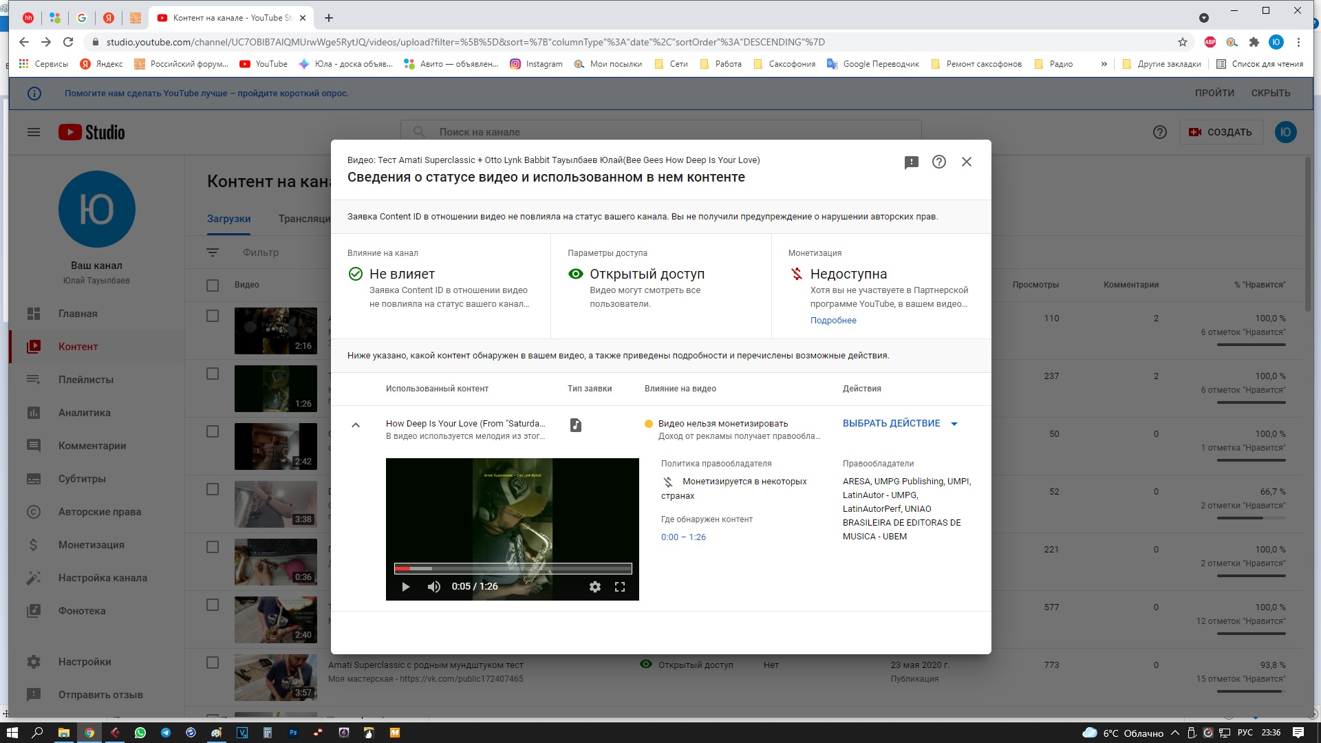 Это робот мелодию узнал, у Вас же в скрине написано. Дело не в минусе. Переживать не стоит, видео доступно, просто Вы не можете его монетизировать.