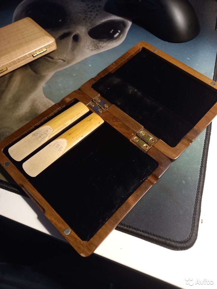 Два кейса (на 2 или 5-6 тростей) для тростей саксофона или кларнета. Покупал на алибабе за 2.000 большой кейс и за 1000 маленький.