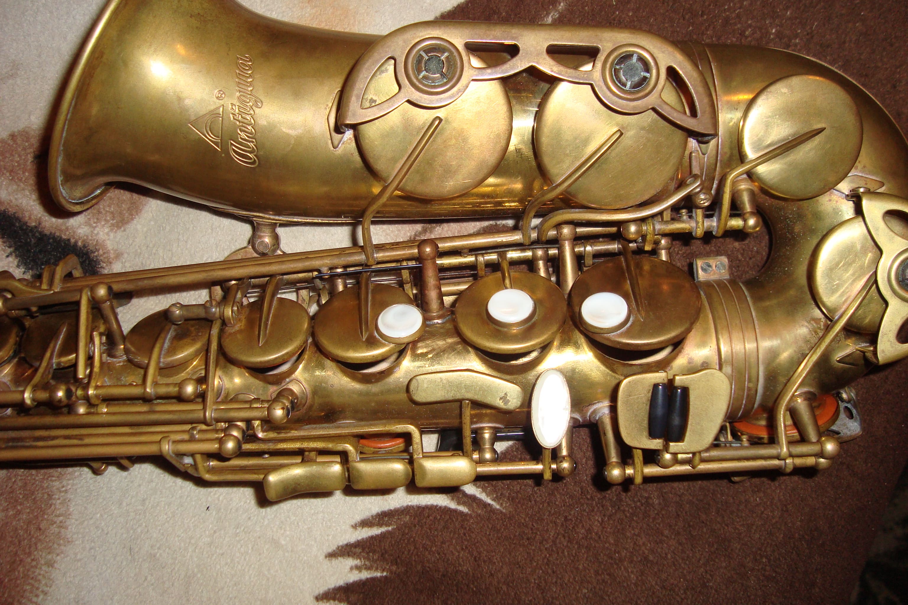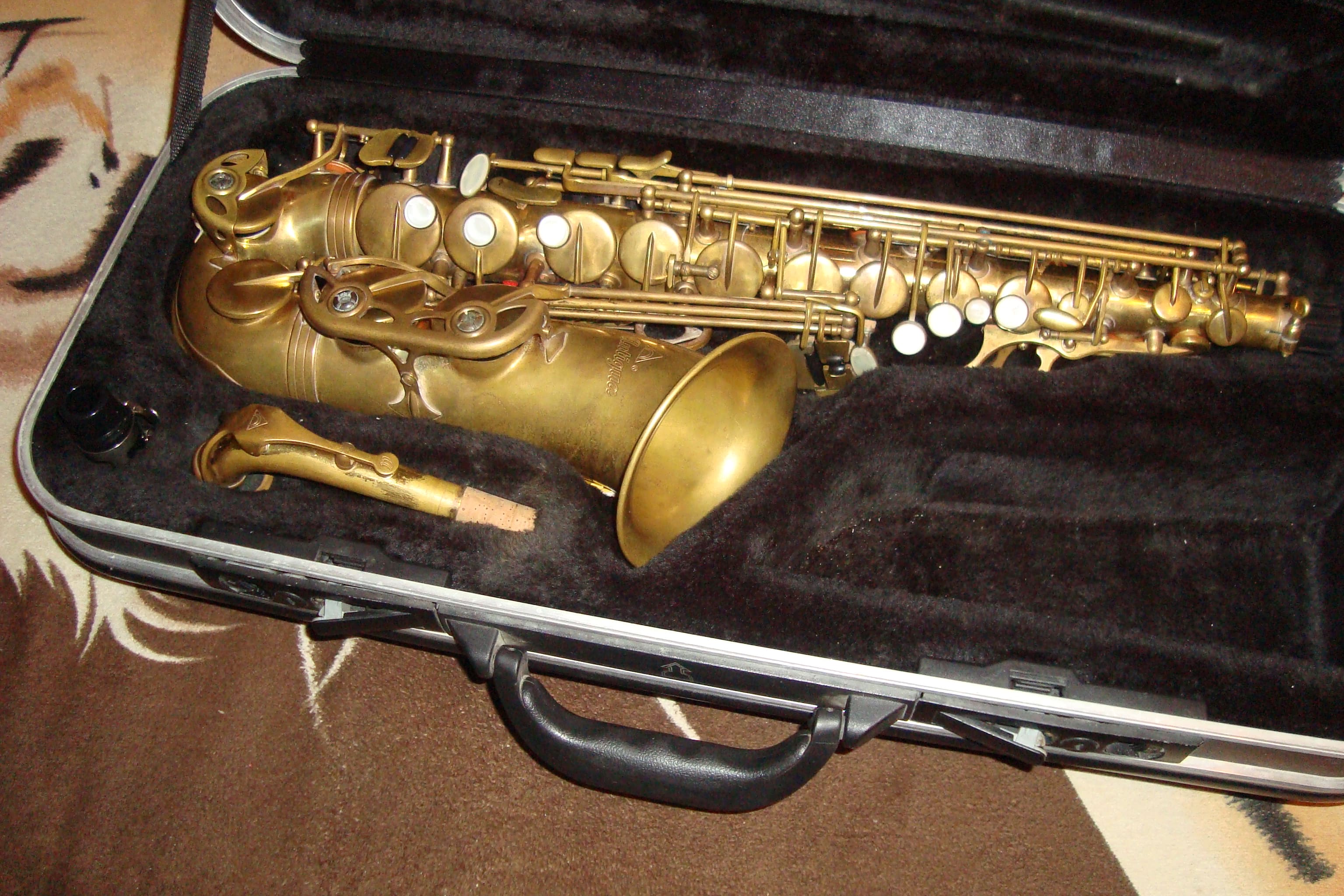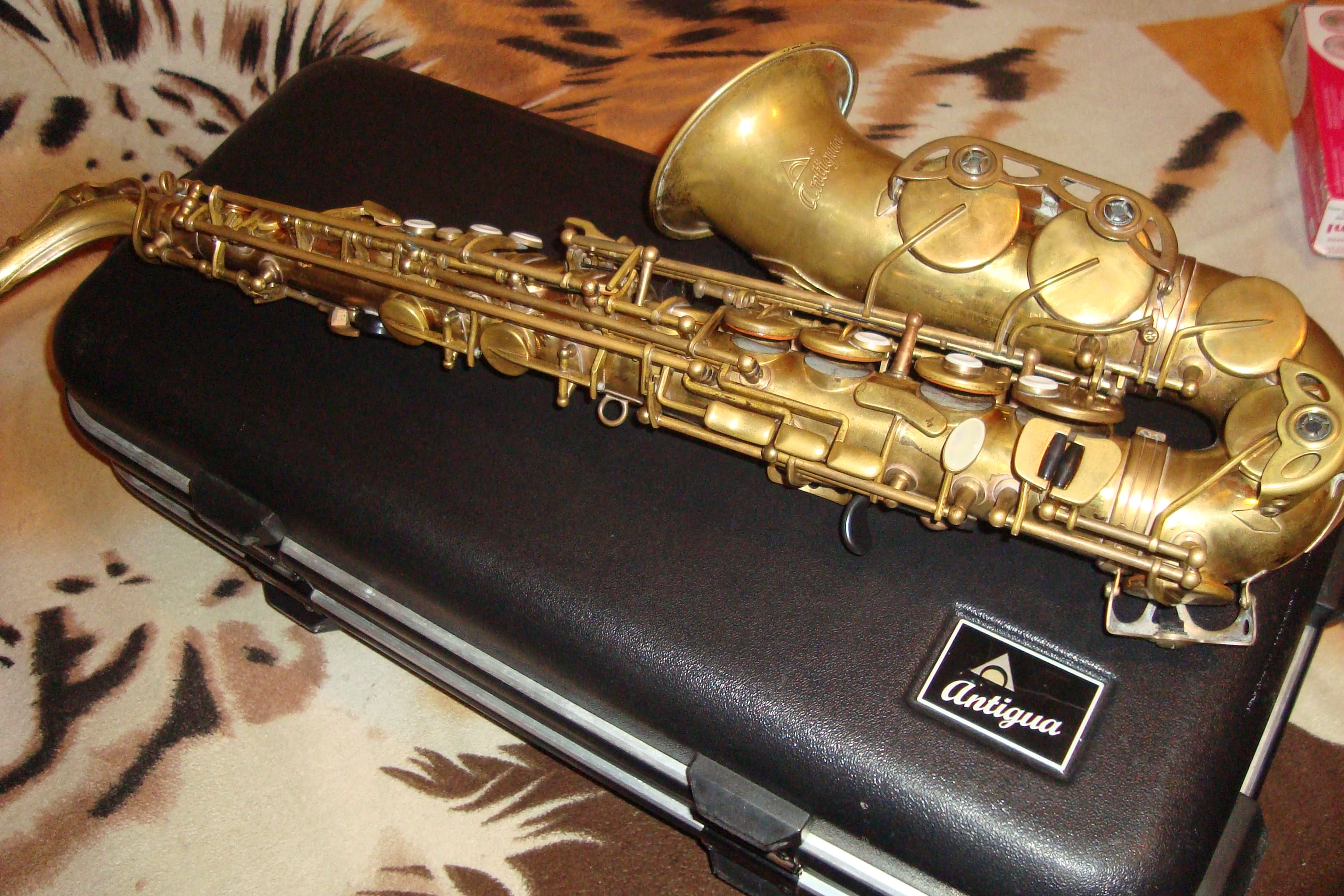 Продам тайваньский саксофон альт Антигуа, полупроф. Механика кованая, инструмент обезлачен, но имеются места с оставшимся золотым лаком.Инструмент реставрировал известный уфимский мастер Yafar, в прошлом году. Пек и вмятин нет, кроет и строит.Роскошный кофр с двумя ручками. Прошу скромные 32000 рублей. Телефон 8-937-096-12-20
