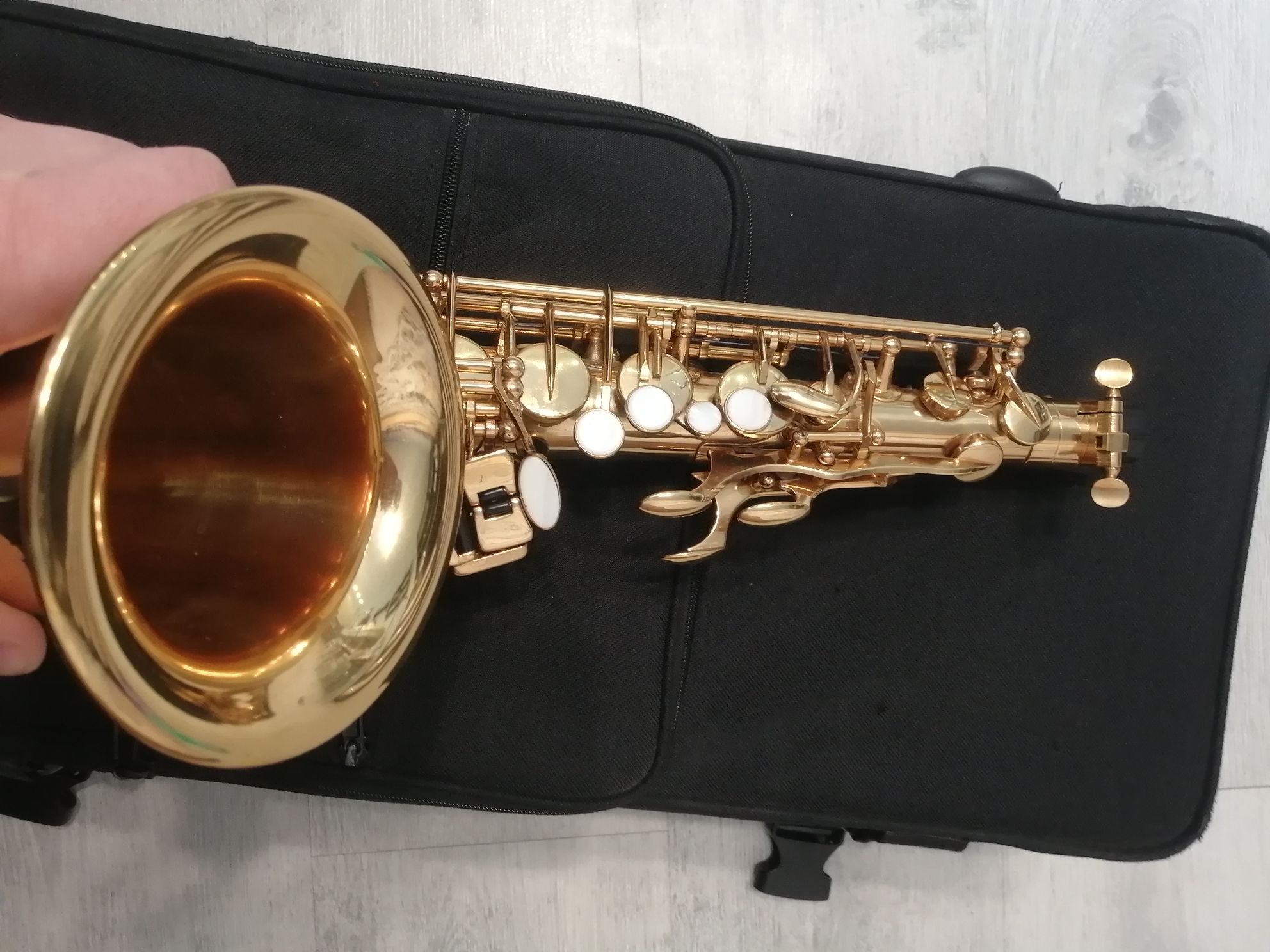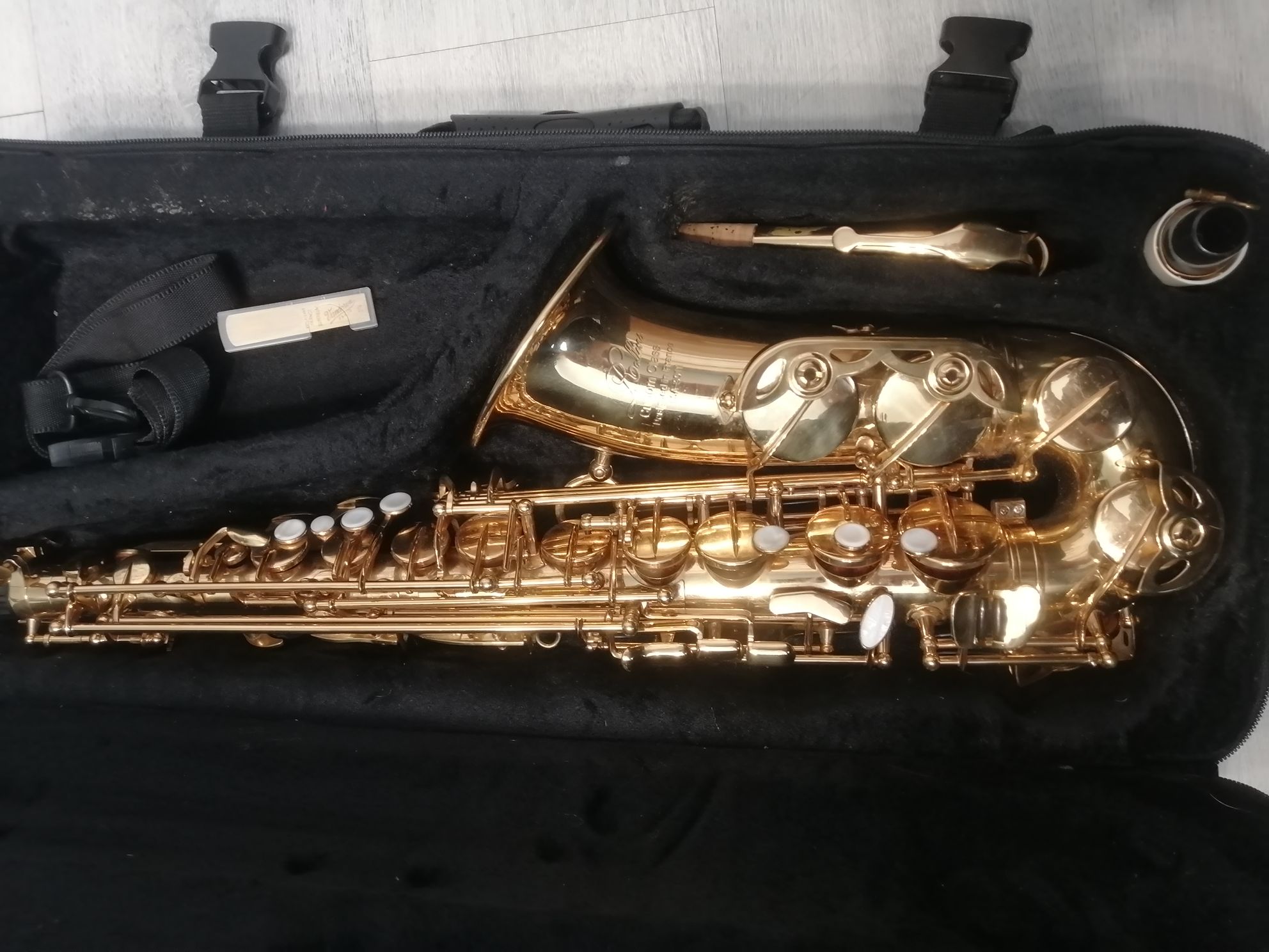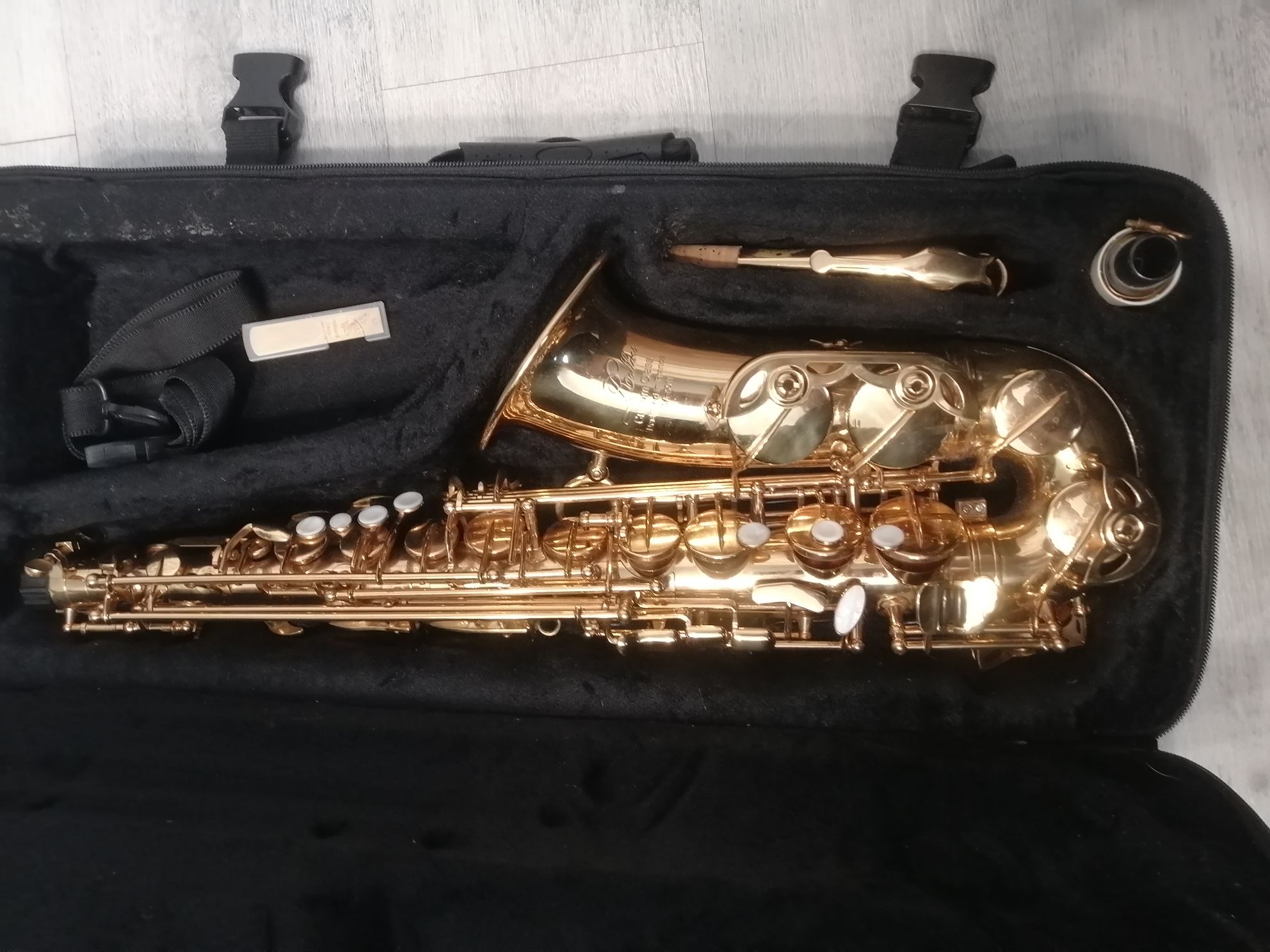 Комплектация полная: саксофон, эска, мундштук с лигатурой и колпачком , гайтан, кофр, трость, наклейки на мундштук. Внимательно смотрите фото и видео звучания инструмента.