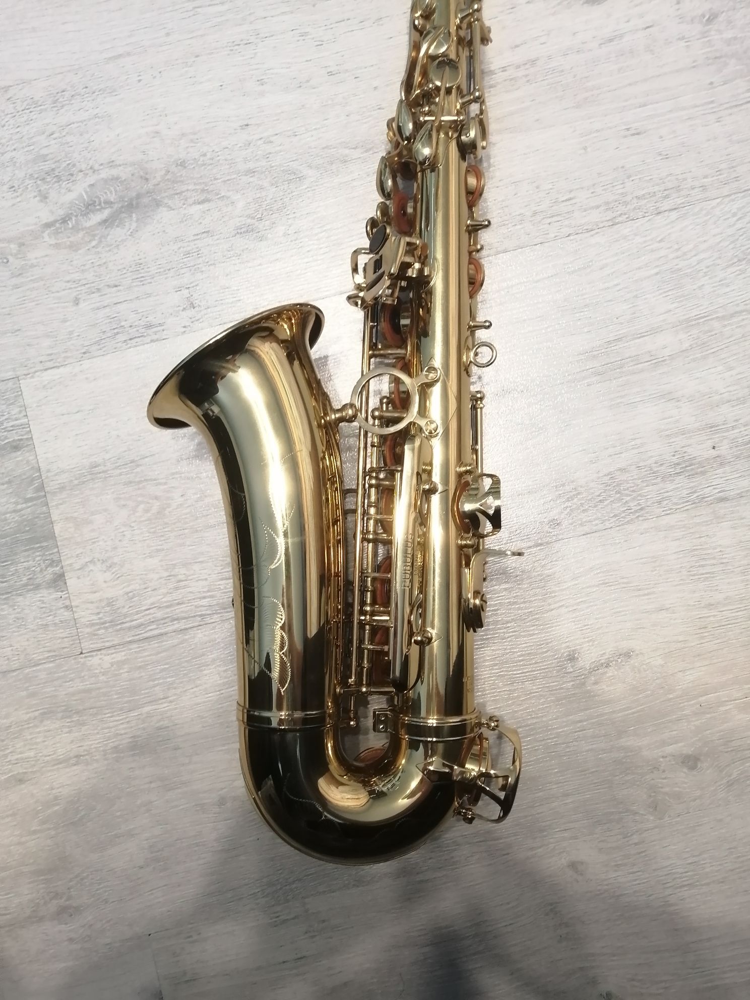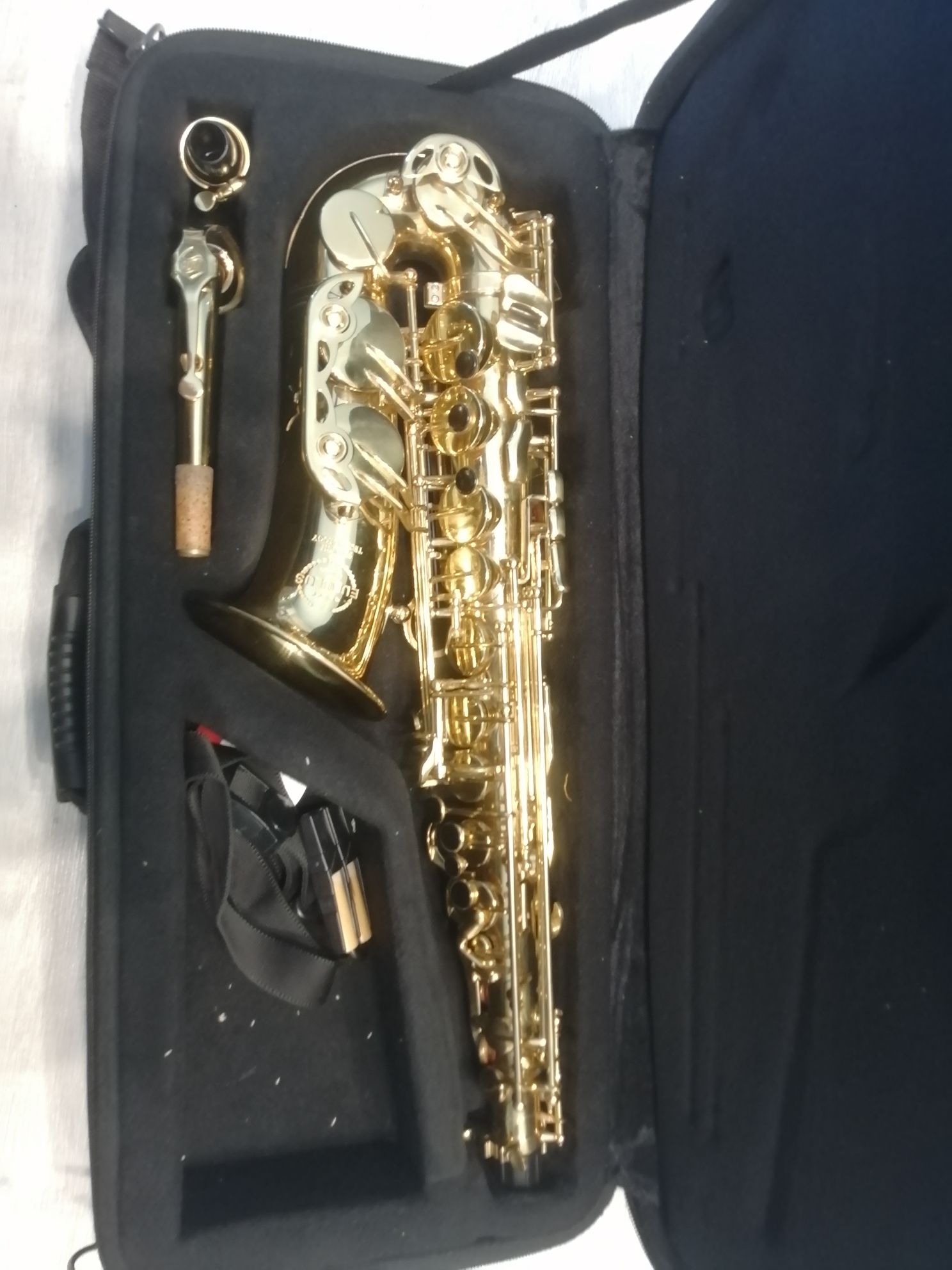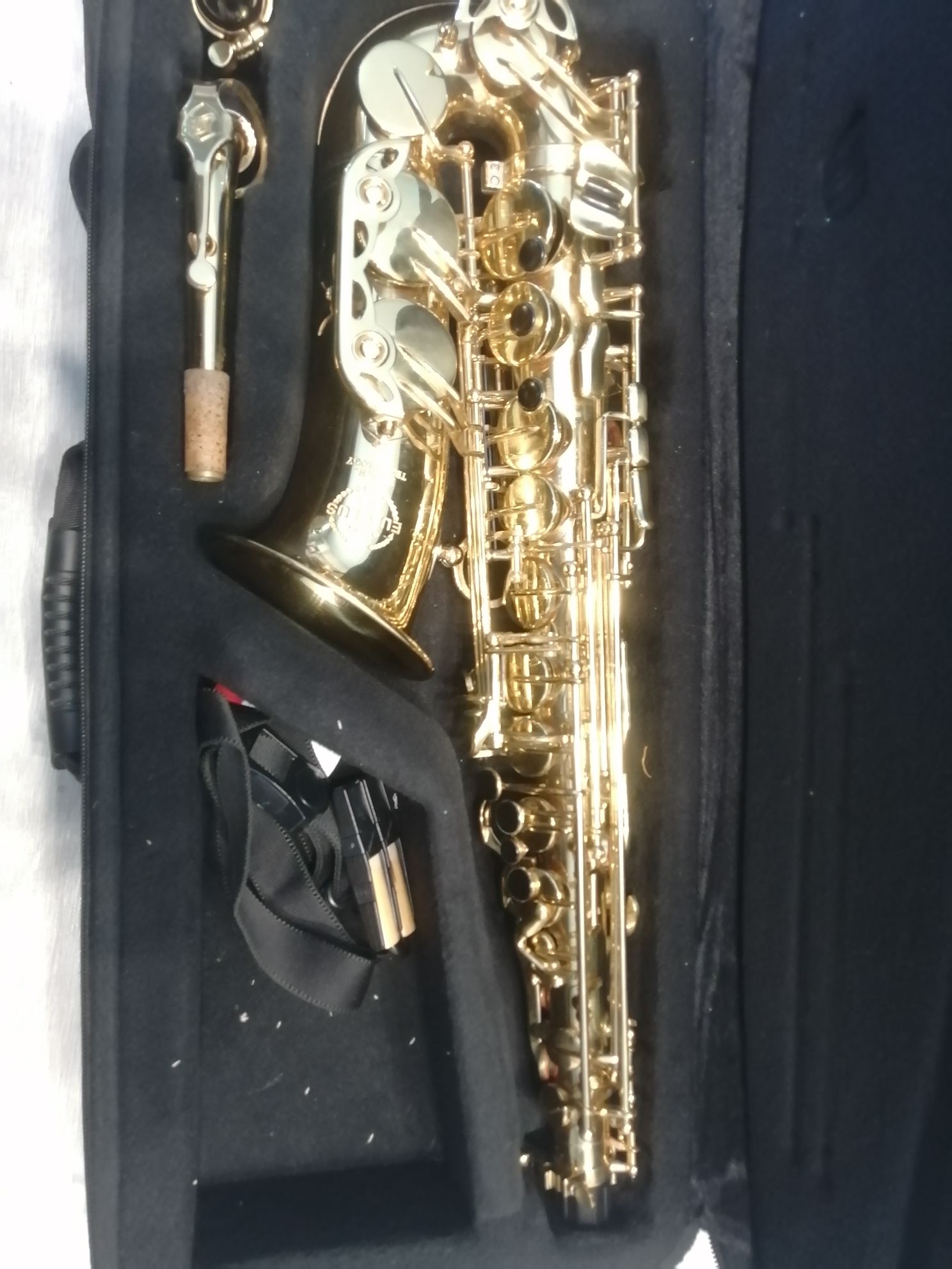 Комплектация полная: саксофон, эска, мундштук с лигатурой и колпачком , гайтан, кофр, трость, наклейки на мундштук. Внимательно смотрите фото и видео звучания инструмента.