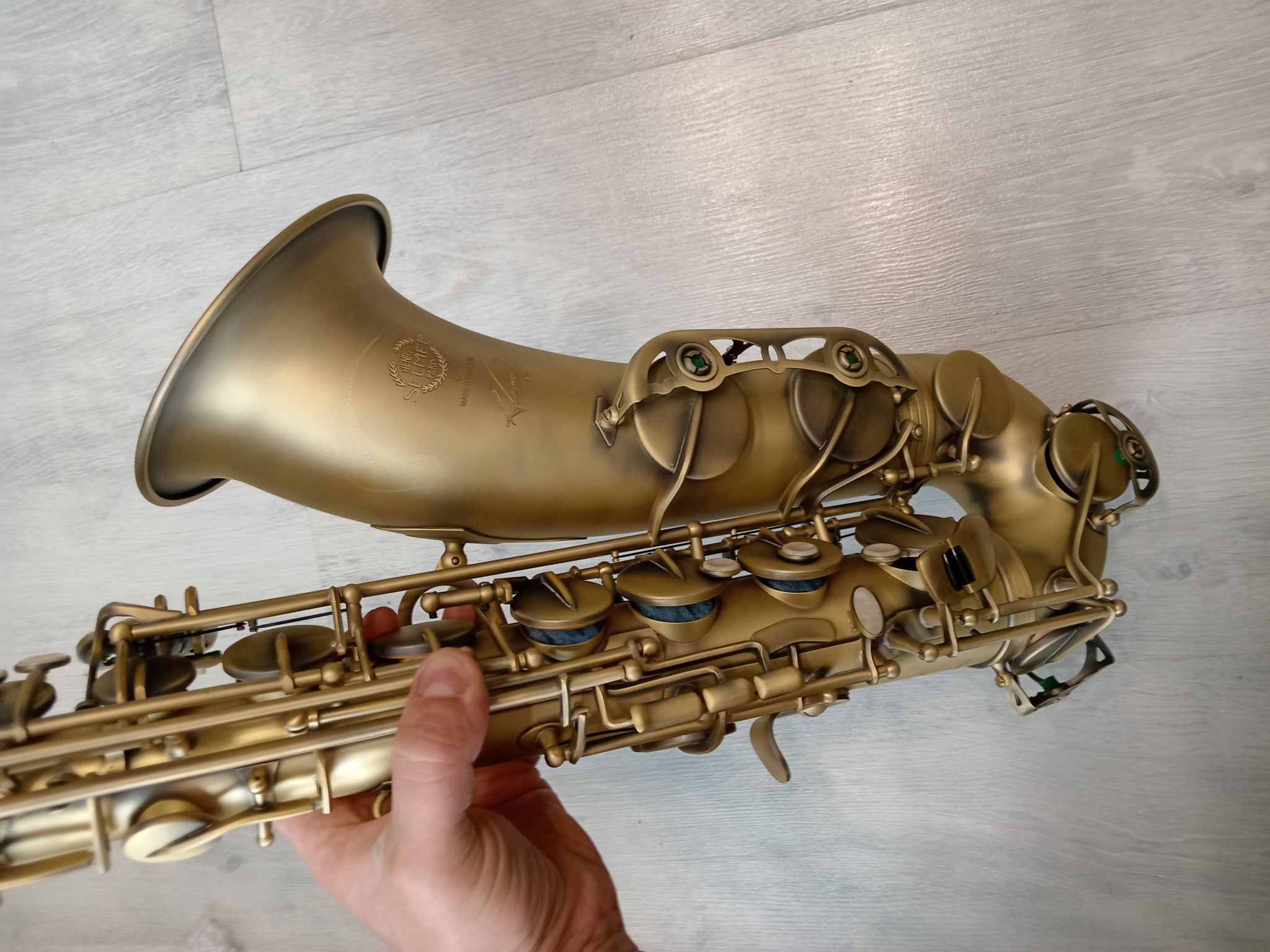 Комплектация полная: саксофон, эска, мундштук с лигатурой и колпачком, фирменный, полужёсткий кофр "Selmer" чехол, гайтан (нашейный подвеc) , смазка для пробки эски, наклейка на мундштук, трость.