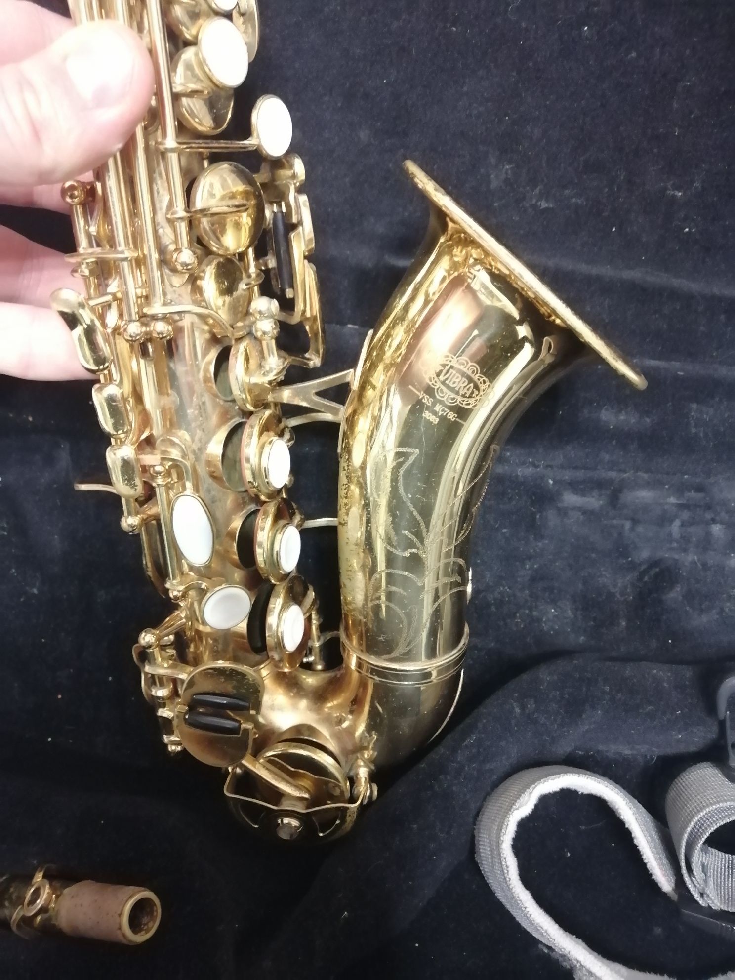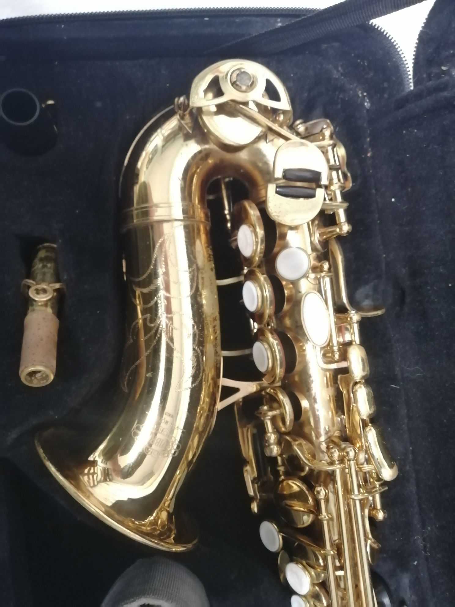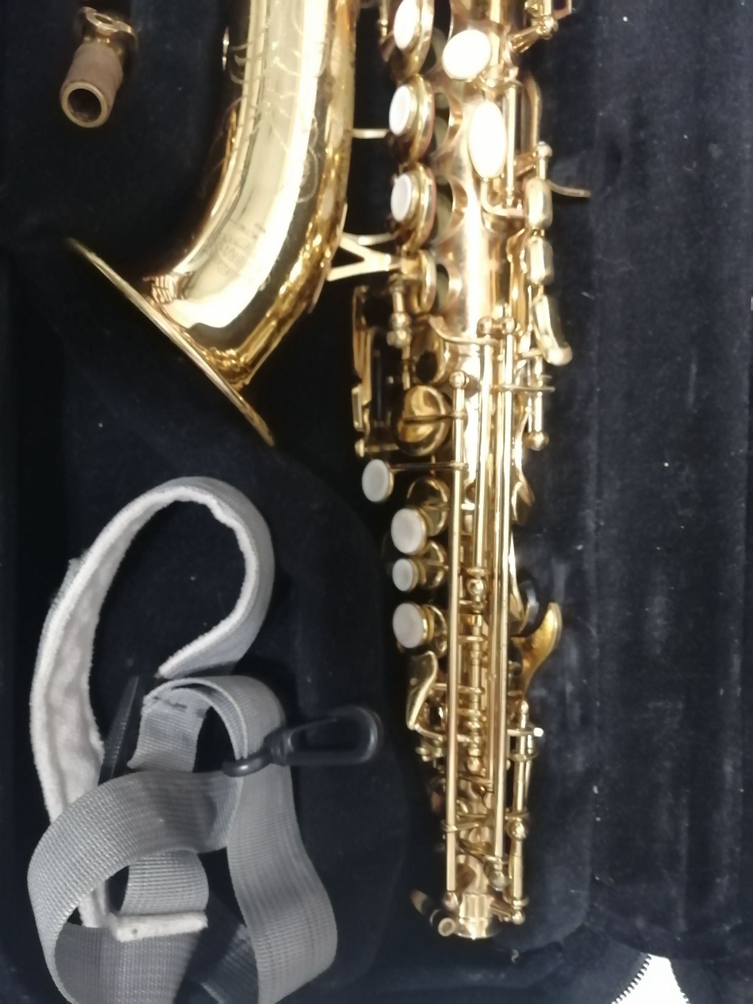 На корпусе саксофона есть потертости (внимательно смотрите фото), которые на качество звука не влияют. Комплектация полная: саксофон, эска, мундштук с лигатурой и колпачком , жёсткий родной фирменный чехол , трости, гайтан, наклейки на мундштук, смазка для пробки. Смотрите фото и видео