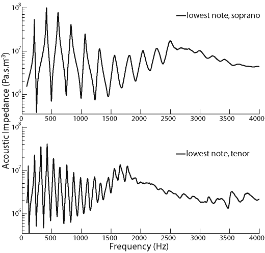 Акустический отклик духовых инструментов часто определяется количественно с помощью спектра акустического сопротивления, который мы обсудим ниже . Это определяет, насколько сложно заставить воздух вибрировать с заданной частотой или какое акустическое давление создается вибрацией воздуха с заданной частотой. Саксофоны работают на пиках сопротивлений (импеданса). На графиках вверху справа показаны спектры сопротивлений для низкого Bb сопрано и тенора. Инструмент будет воспроизводить несколько из этих пиков - гудеть.